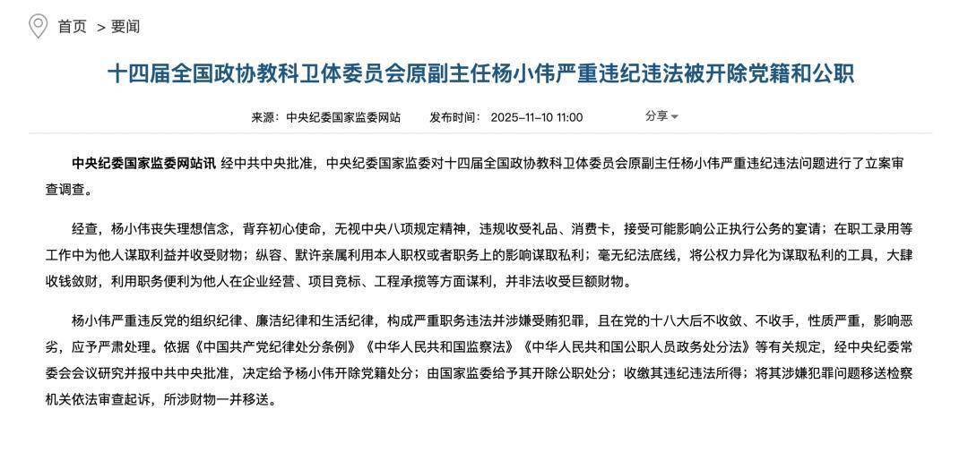 经中共中央批准,中央纪委国家监委对十四届全国政协教科卫体委员会原副主任杨小伟严重违纪违法问题进行了立案审查调查。