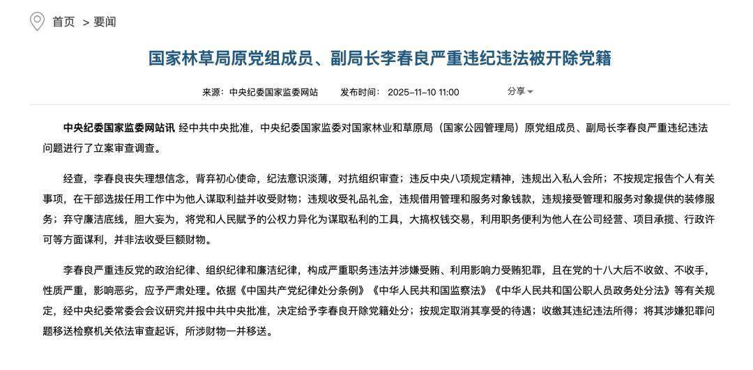 经中共中央批准,中央纪委国家监委对国家林业和草原局(国家公园管理局)原党组成员、副局长李春良严重违纪违法问题进行了立案审查调查。